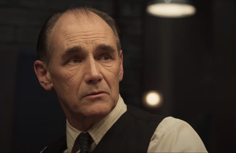 You are either in abject thrall to Mark Rylance (above), or you’ve never heard of him. There’s actually no other position to take. Whether you discovered him as Thomas Cromwell in TV’s “Wolf Hall,” in his Oscar-winning supporting role in Spielberg’s “Bridge of Spies,” or you’re just mesmerized by the guy with the weird teeth playing the tech CEO in Netflix’s “Don’t Look Up,” you know that Rylance can mesmerize an audience by using the least gestures possible. He is a master of economy; you lean in watching him, so as not to miss a thing. That he’s in virtually every frame of “The Outfit,” a new movie arriving in theaters today, should be cause for celebration.