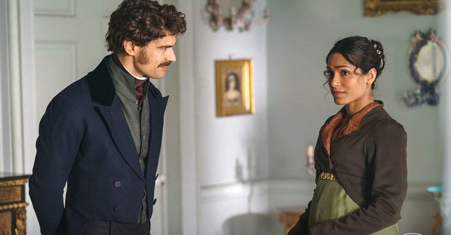 The early scenes of “Mr. Malcolm’s List” are dreadful: Stiff acting and forced period banter while the filmmakers fill the screen with production design: Hats! Finery! Feathers! Hansoms! Then the plot machinery takes over and you strap in just to see how everything turns out in the end. It’s the story of a country mouse and a city pussycat: The latter, Julia Thistlewaite (Zawe Ashton), is a London society queen, vain and not terribly bright, and she can’t win over the town’s most eligible bachelor, Jeremiah Malcolm (Sope Dirisu), whose pride (nudge, nudge) is evident in the list he keeps of the ten qualifications any future Mrs. Malcolm must possess. Aiming to humble him, Julia brings her old boarding school friend Selena Dalton (Freida Pinto) from out of the countryside up to London, and enlists her in a plan to check off every item on Mr. Malcolm’s List and then spurn him. The twist is that the gentle, intelligent Selena already fills the bill, and the first scenes between Pinto and Dirisu are charged with a shy heat that’s rather delightful — it’s nice to see Pinto as more than romantic support for once, and in a role that’s in her narrow but empathetic range. Complications must intervene or the movie would be over in 30 minutes, and enter Theo James, wiping his brow in relief from escaping “Sanditon,” as a rascally officer and rival for Selena’s affections. And so on.