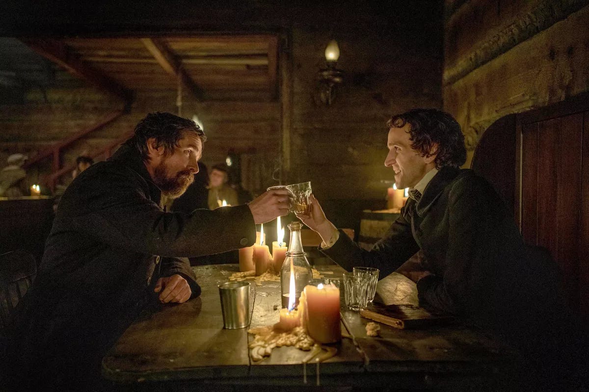 But movies, okay, sure, movies. The best part of “The Pale Blue Eye” (⭐ ⭐ 1/2, streaming on Netflix) is the center-ring acting smackdown between Christian “Method Man” Bale (above left) and Harry “The Dynamite Kid” Melling (above right), a battle royale of brooding charisma vs. flamboyant hambone. Based on a novel by Louis Bayard, Scott Cooper’s film is set in 1830, at a wintry West Point Military Academy swaddled in mist and almost completely desaturated of color. A cadet has been murdered, a celebrated police detective lives nearby, the game is afoot. Bale plays the sleuth with a mouthful of beard and a mournful sense of purpose; he’s wilier than the stiff-backed military men who have brought him in but intrigued by one of the victim’s fellow cadets, an eccentric young man named Edgar Allan Poe (Melling), who becomes a campy, high-spirited Watson to the detective’s Hudson Highlands Holmes.