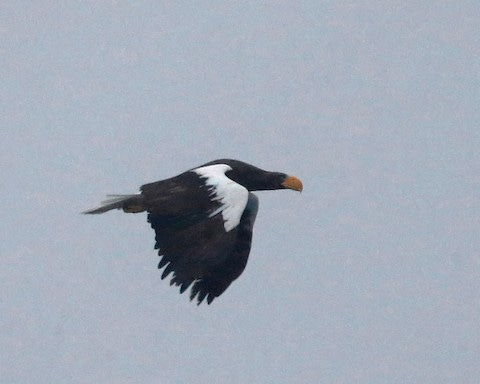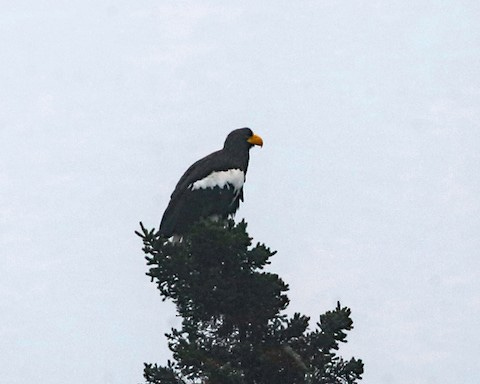 I read later that after my wife and I left, the sea-eagle rose up from its tree and chased a bald eagle that had just caught a fish, eventually soaring about 15 feet over the heads of the assembled crowd. Wish I’d seen that, but grateful for what I did see. And more than a little sad, too, because this sea-eagle – possibly female, since they’re larger than the males, and this bird was big – will almost certainly never get back to its kind. Birds that have flown or been blown off course and wind up a continent or two away from their home range are called vagrants, a word that carries a tinge of unnecessary moral disapproval. There’s no such thing as a reprehensible bird (although cowbirds come close), only a bird whose compass has been rendered inoperative through chance or mis-wiring and who has no idea that he or she is on a train headed in the wrong direction. In almost every single case, the vagrant will eventually perish in an inhospitable environment, and even if our Steller’s Sea-Eagle seems particularly hardy, he/she is doubtless expecting to run into a mate who just isn’t there.